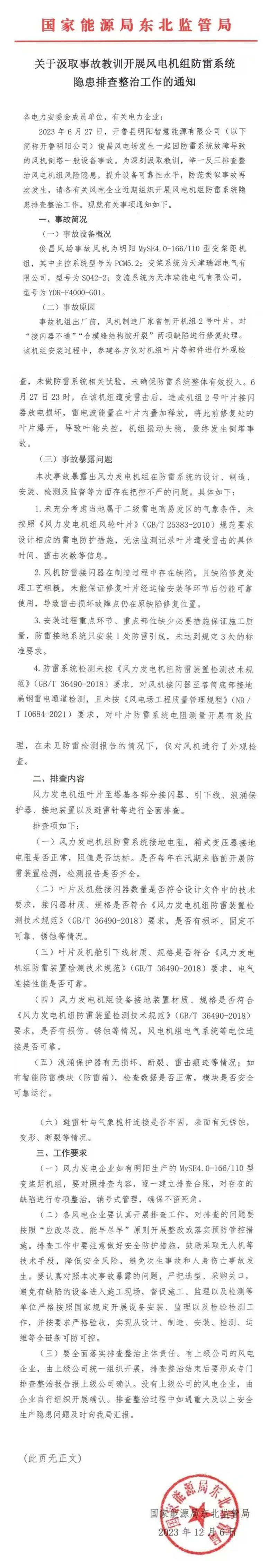 近日,国家能源局东北监管局发布《关于汲取事故教训开展风电机组防雷系统隐患排查整治工作的通报》。