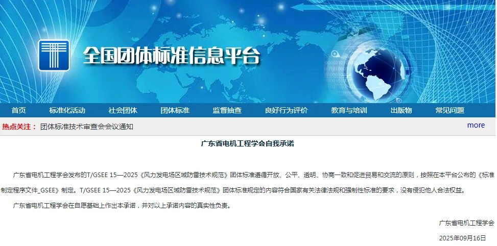 日前,广东省电机工程学会发布《风力发电场区域防雷技术规范》(T/GSEE 15-2025),这一全国首创的风电场区域防雷团体标准已于2025年9月10日正式实施,标志着我国风力发电场防雷保护工作迈入标准化、规范化的新阶段。