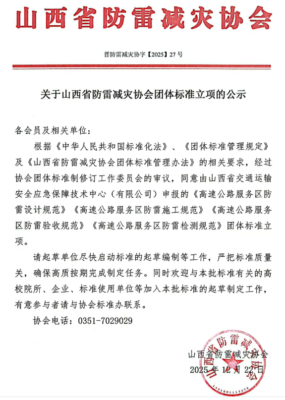 雷设计规范》《高速公路服务区防雷施工规范》《高速公路服务区防雷验收规范》《高速公路服务区防雷检测规范》团体标准立项。