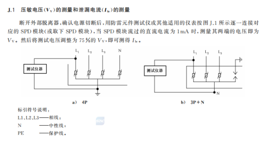 (二)对于检测项目也不是每种SPD都能测量。压敏电压(VV),泄漏电流(Ile)两个参数只能对以金属氧化物压敏电阻(MOV)为限压元件且无串并联其他元件的电源 SPD进行测量,是可选项。因此检测前也要查阅电涌保护器的铭牌(说明书)等来决定是否对电涌保护器的这两个性能参数进行测量。